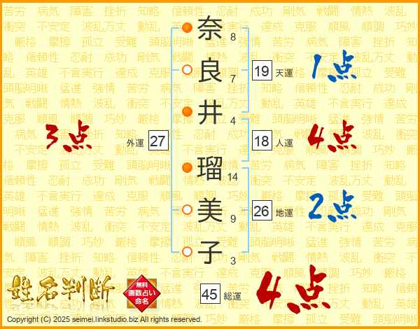 奈(8画)良(7画)井(4画) 瑠(14画)美(9画)子(3画)