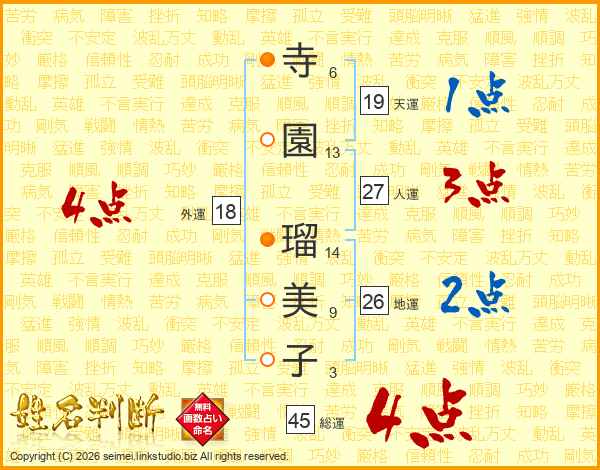 寺(6画)園(13画) 瑠(14画)美(9画)子(3画)