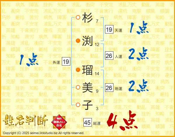 杉(7画)渕(12画) 瑠(14画)美(9画)子(3画)