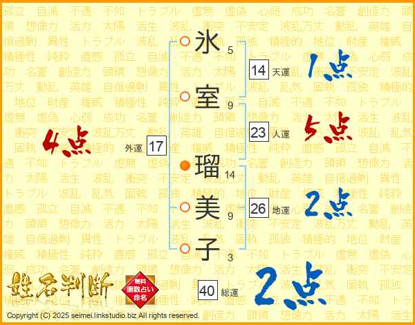 氷(5画)室(9画) 瑠(14画)美(9画)子(3画)