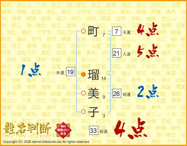 町(7画) 瑠(14画)美(9画)子(3画)