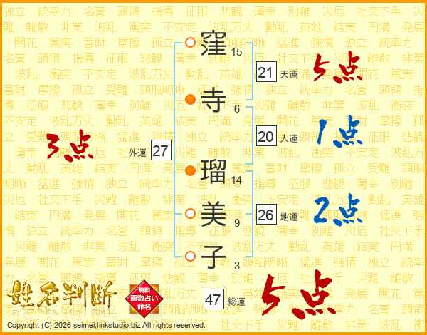 窪(15画)寺(6画) 瑠(14画)美(9画)子(3画)