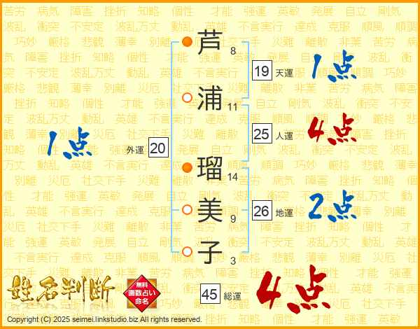 芦(8画)浦(11画) 瑠(14画)美(9画)子(3画)