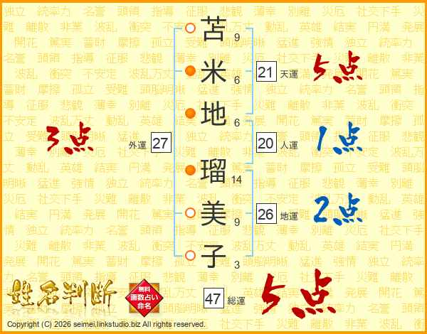 苫(9画)米(6画)地(6画) 瑠(14画)美(9画)子(3画)