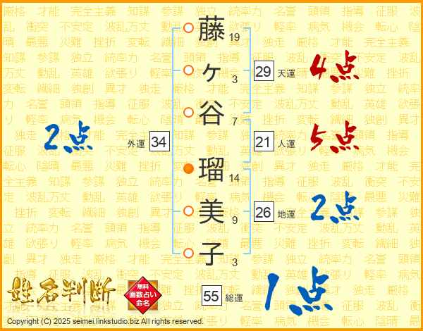 藤(19画)ヶ(3画)谷(7画) 瑠(14画)美(9画)子(3画)