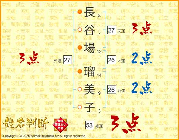 長(8画)谷(7画)場(12画) 瑠(14画)美(9画)子(3画)