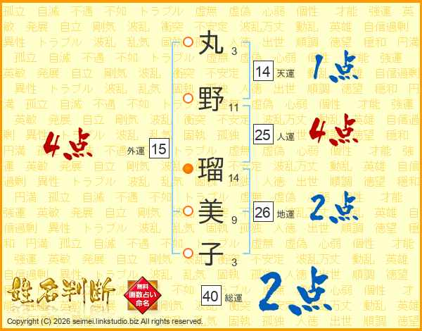丸(3画)野(11画) 瑠(14画)美(9画)子(3画)