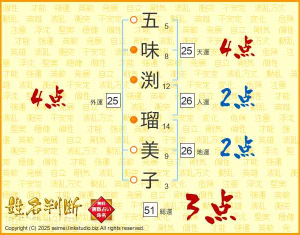 五(5画)味(8画)渕(12画) 瑠(14画)美(9画)子(3画)