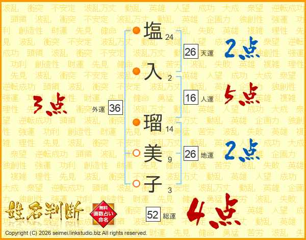 塩(24画)入(2画) 瑠(14画)美(9画)子(3画)