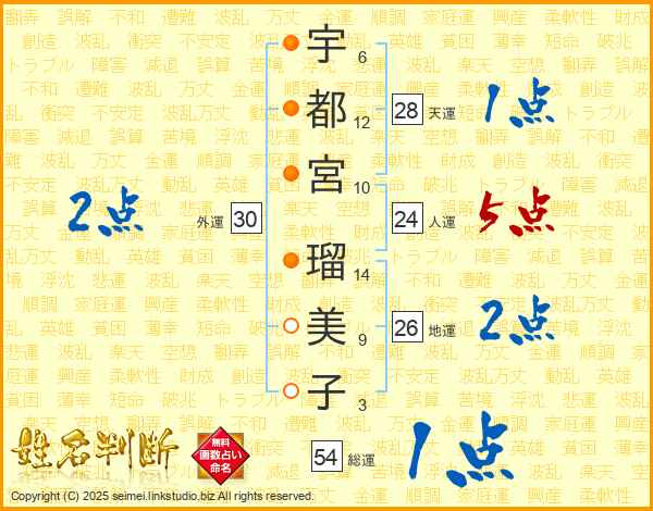 宇(6画)都(12画)宮(10画) 瑠(14画)美(9画)子(3画)