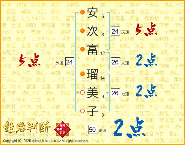 安(6画)次(6画)富(12画) 瑠(14画)美(9画)子(3画)