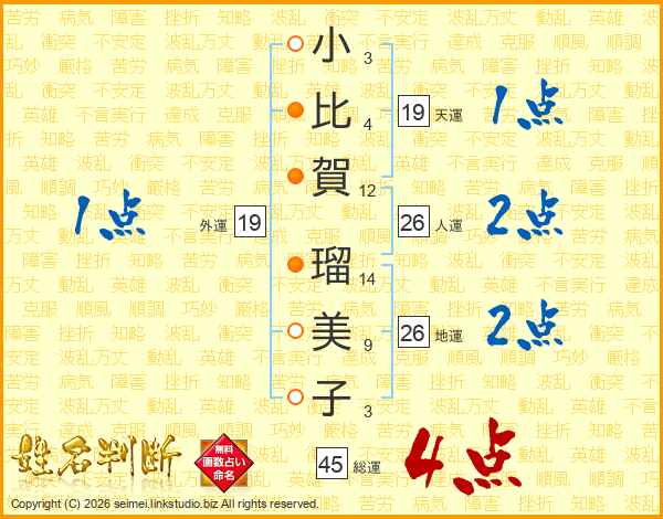 小(3画)比(4画)賀(12画) 瑠(14画)美(9画)子(3画)