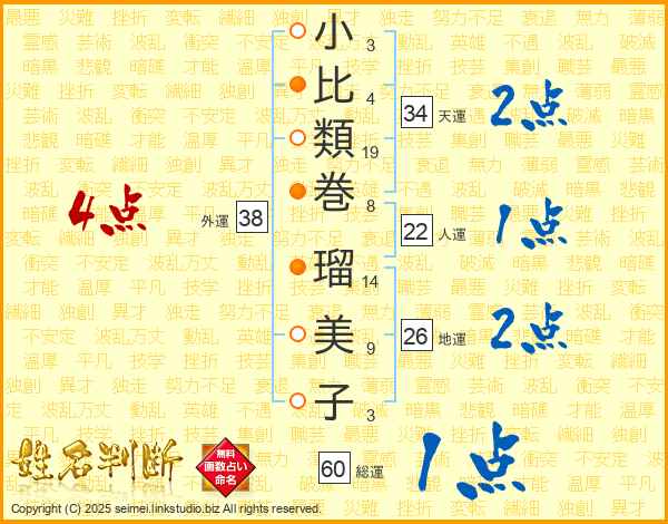 小(3画)比(4画)類(19画)巻(8画) 瑠(14画)美(9画)子(3画)
