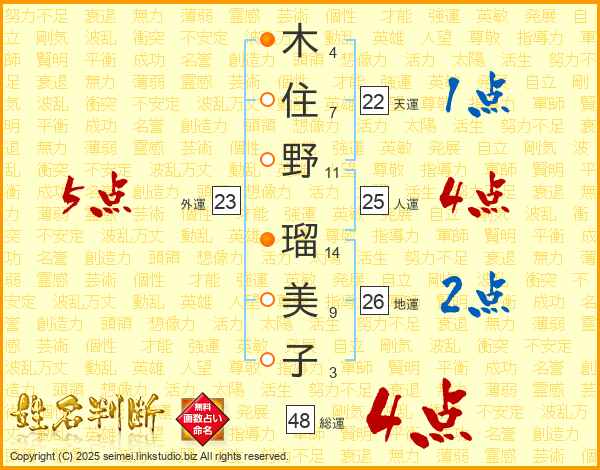 木(4画)住(7画)野(11画) 瑠(14画)美(9画)子(3画)