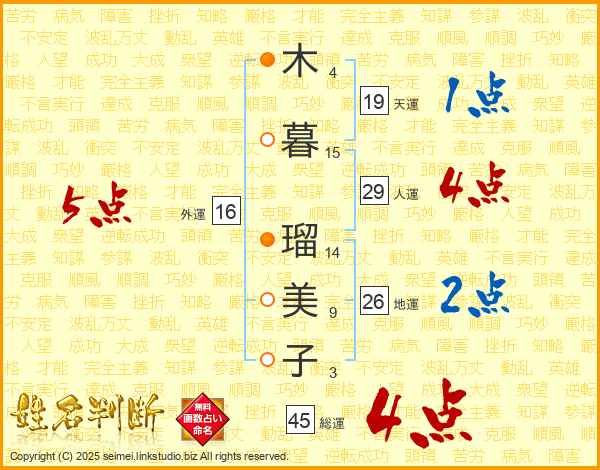 木(4画)暮(15画) 瑠(14画)美(9画)子(3画)