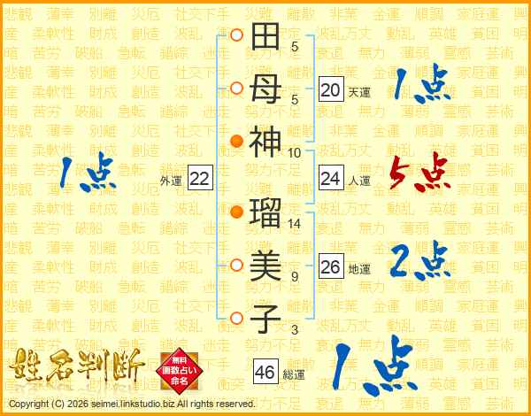 田(5画)母(5画)神(10画) 瑠(14画)美(9画)子(3画)