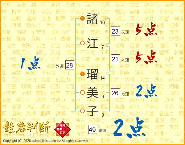 諸(16画)江(7画) 瑠(14画)美(9画)子(3画)