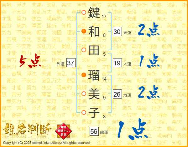 鍵(17画)和(8画)田(5画) 瑠(14画)美(9画)子(3画)
