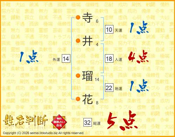 寺(6画)井(4画) 瑠(14画)花(8画)
