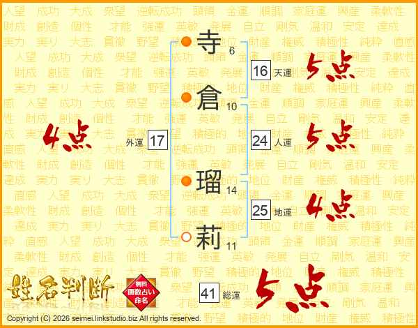 寺(6画)倉(10画) 瑠(14画)莉(11画)