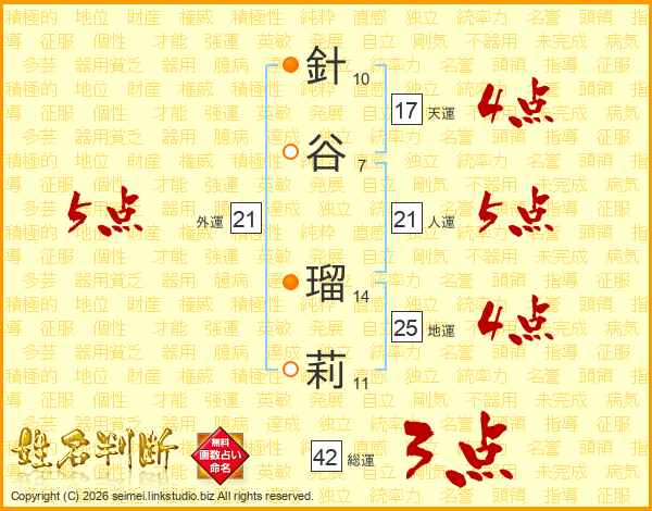 針(10画)谷(7画) 瑠(14画)莉(11画)