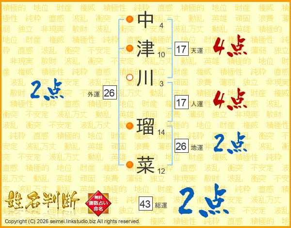 中(4画)津(10画)川(3画) 瑠(14画)菜(12画)