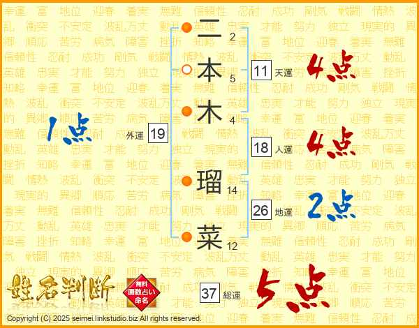 二(2画)本(5画)木(4画) 瑠(14画)菜(12画)