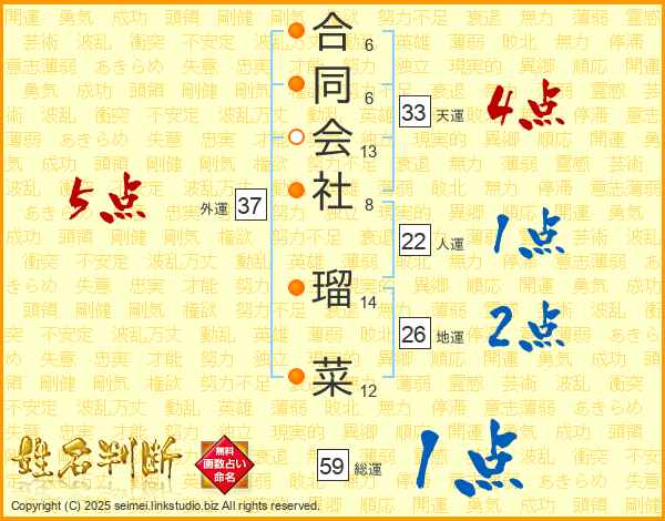 合(6画)同(6画)会(13画)社(8画) 瑠(14画)菜(12画)