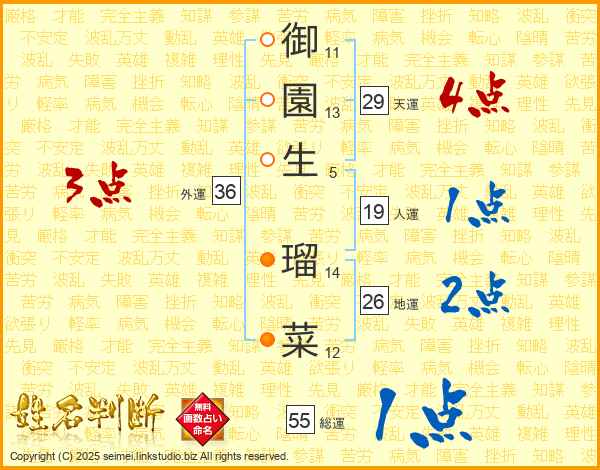 御(11画)園(13画)生(5画) 瑠(14画)菜(12画)