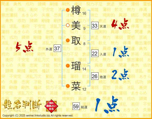 樽(16画)美(9画)取(8画) 瑠(14画)菜(12画)
