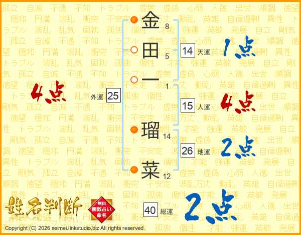 金(8画)田(5画)一(1画) 瑠(14画)菜(12画)