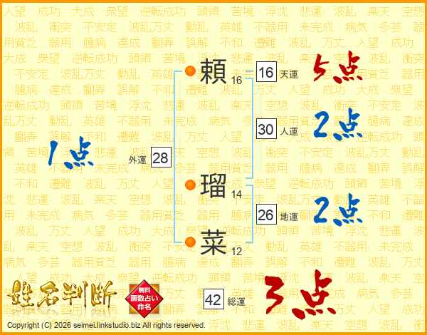 生活面を象徴する運勢です。外部から受ける影響力を表し、結婚運、家庭運や職場、環境への順応性を表します。総運から人運を引いた画数。姓や名が1文字の場合を除く。
