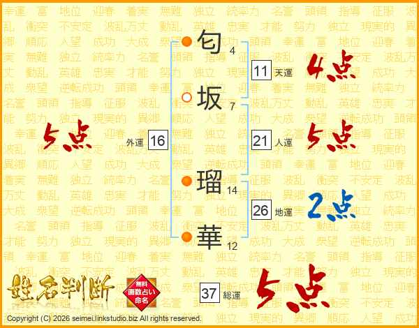 匂(4画)坂(7画) 瑠(14画)華(12画)