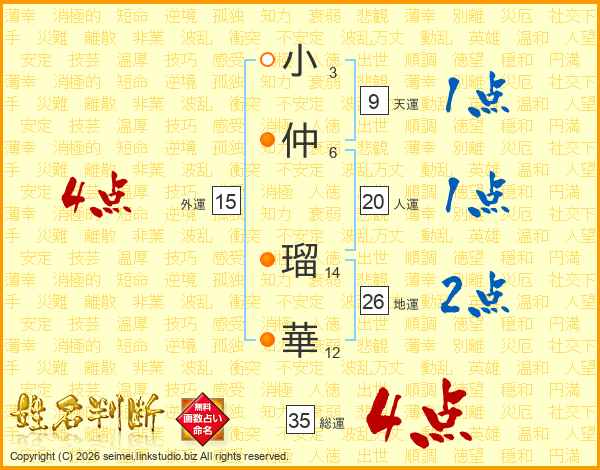 小(3画)仲(6画) 瑠(14画)華(12画)