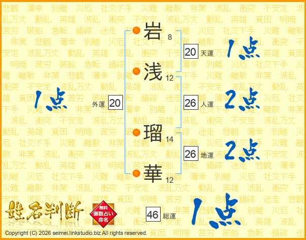 岩(8画)浅(12画) 瑠(14画)華(12画)