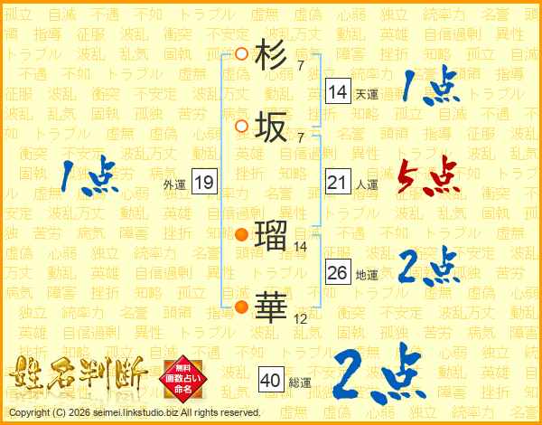 杉(7画)坂(7画) 瑠(14画)華(12画)