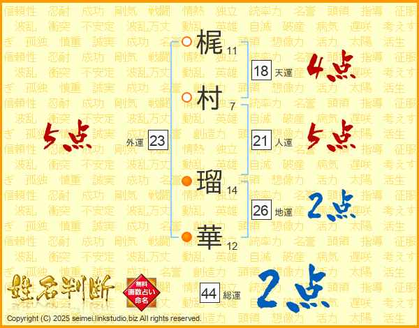 梶(11画)村(7画) 瑠(14画)華(12画)