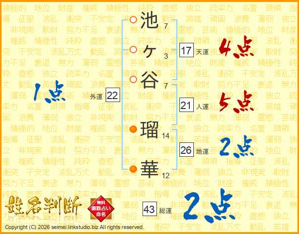 池(7画)ヶ(3画)谷(7画) 瑠(14画)華(12画)