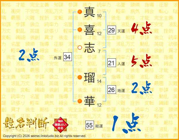 真(10画)喜(12画)志(7画) 瑠(14画)華(12画)