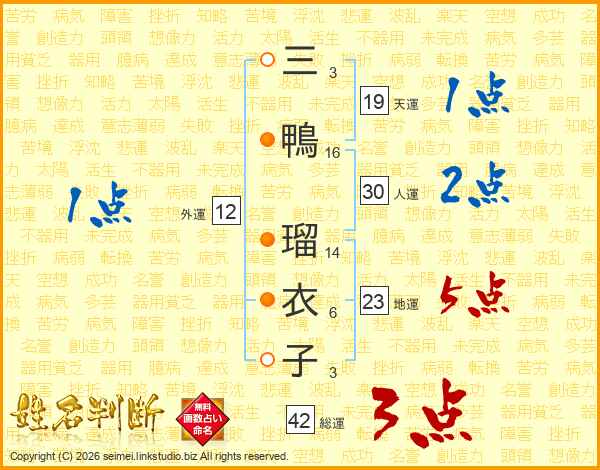 三(3画)鴨(16画) 瑠(14画)衣(6画)子(3画)