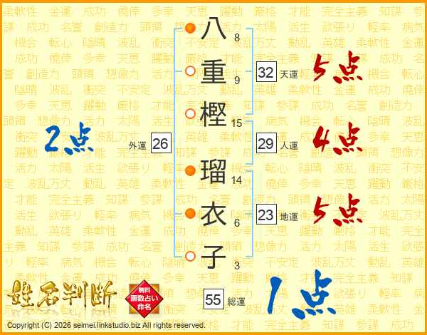 八(8画)重(9画)樫(15画) 瑠(14画)衣(6画)子(3画)
