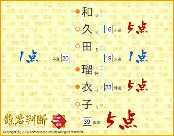 和(8画)久(3画)田(5画) 瑠(14画)衣(6画)子(3画)