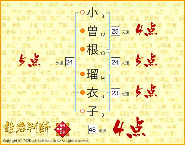 小曽根瑠衣子さんの人運は24画の5点!