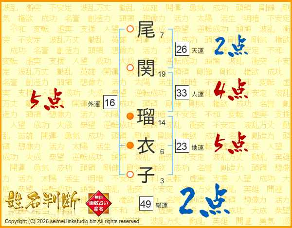 尾(7画)関(19画) 瑠(14画)衣(6画)子(3画)