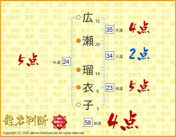 広瀬瑠衣子さんの総運は58画の4点!
