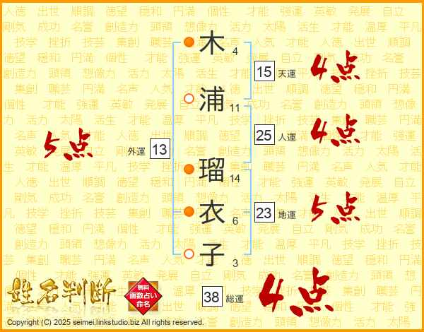 木(4画)浦(11画) 瑠(14画)衣(6画)子(3画)