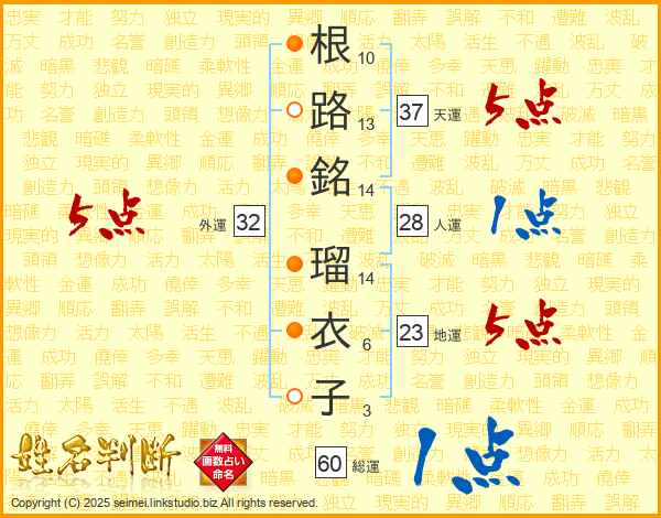 根(10画)路(13画)銘(14画) 瑠(14画)衣(6画)子(3画)