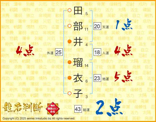 田(5画)部(11画)井(4画) 瑠(14画)衣(6画)子(3画)