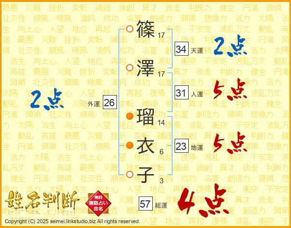 篠(17画)澤(17画) 瑠(14画)衣(6画)子(3画)