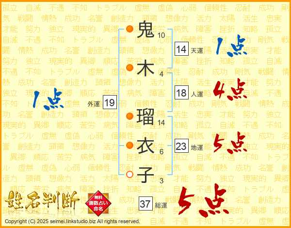 鬼(10画)木(4画) 瑠(14画)衣(6画)子(3画)